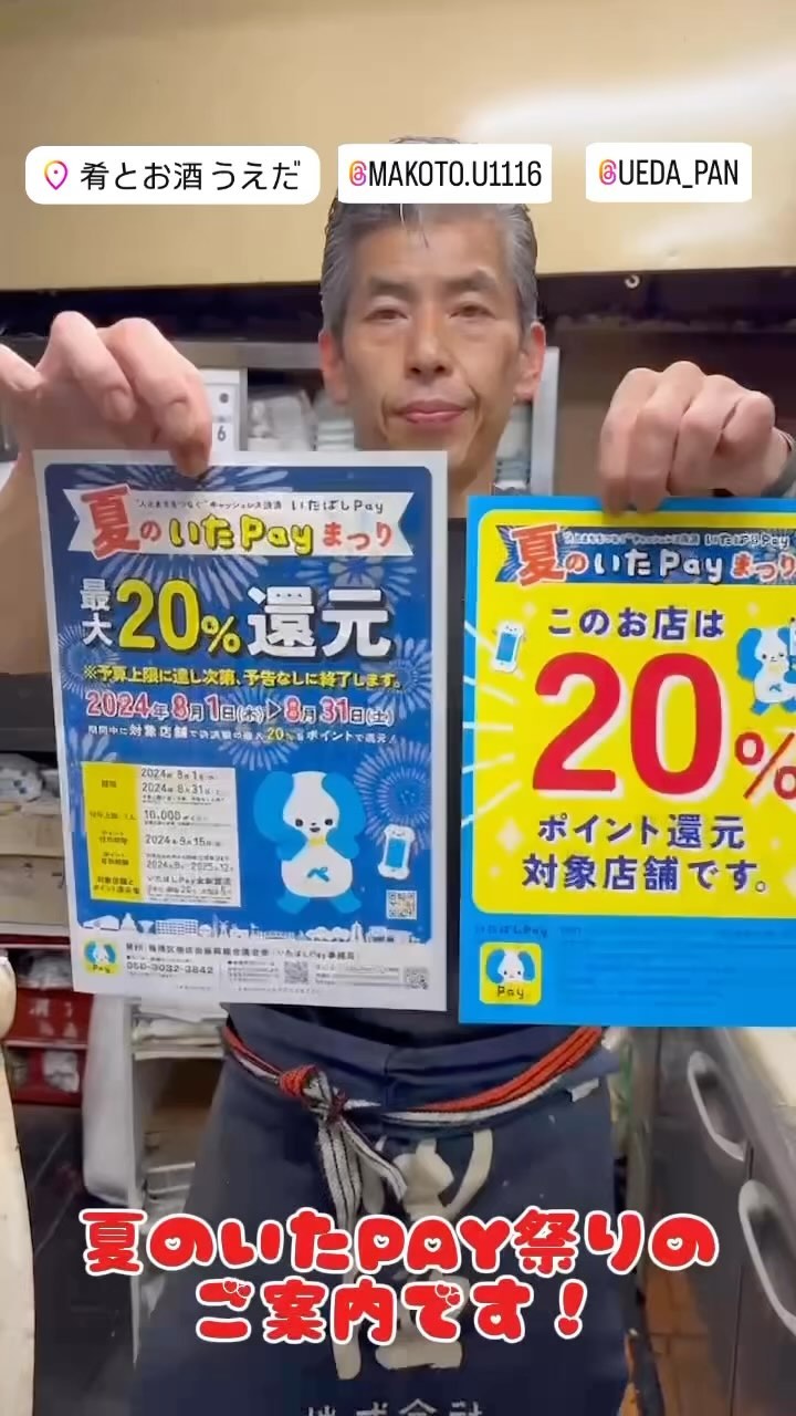 皆様へ「肴とお酒うえだ」からの ご案内 夏のいたPAYまつり開催中 (8/1〜8/31)まで な!な!なんとご飲食代の 20%ポイント還元! うえだ店にて実質2…